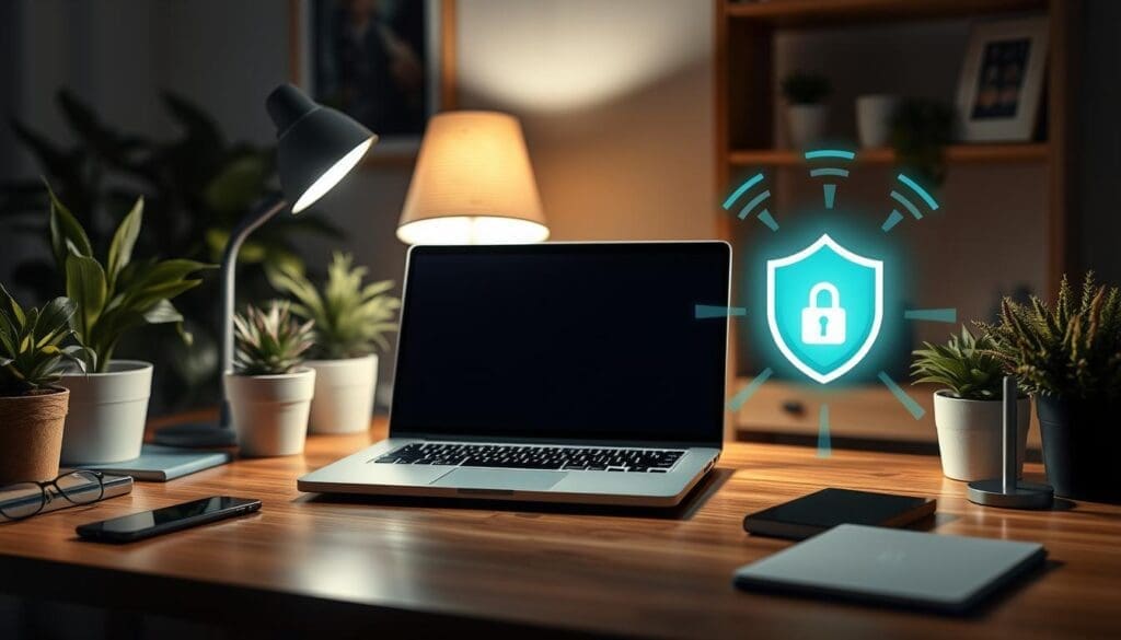 A cozy home office setup with a sleek laptop on a wooden desk, surrounded by plants and personal items, a secure lock symbol visible on the screen, a soft glow of a lamp, wireless router in the background emitting signals, and a digital shield icon subtly integrated into the decor, conveying a sense of security in remote work.