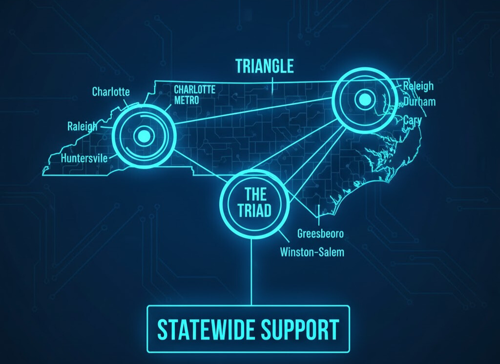 We support cloud clients throughout North Carolina using remote-first service for speed, with on-site expertise available for larger migrations, infrastructure dependencies, or multi-site planning.