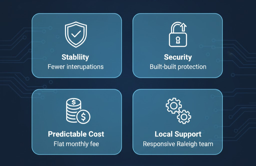 Our managed services focus on businesses in and around Raleigh. We combine remote support for speed with scheduled on-site visits for infrastructure changes and urgent issues.